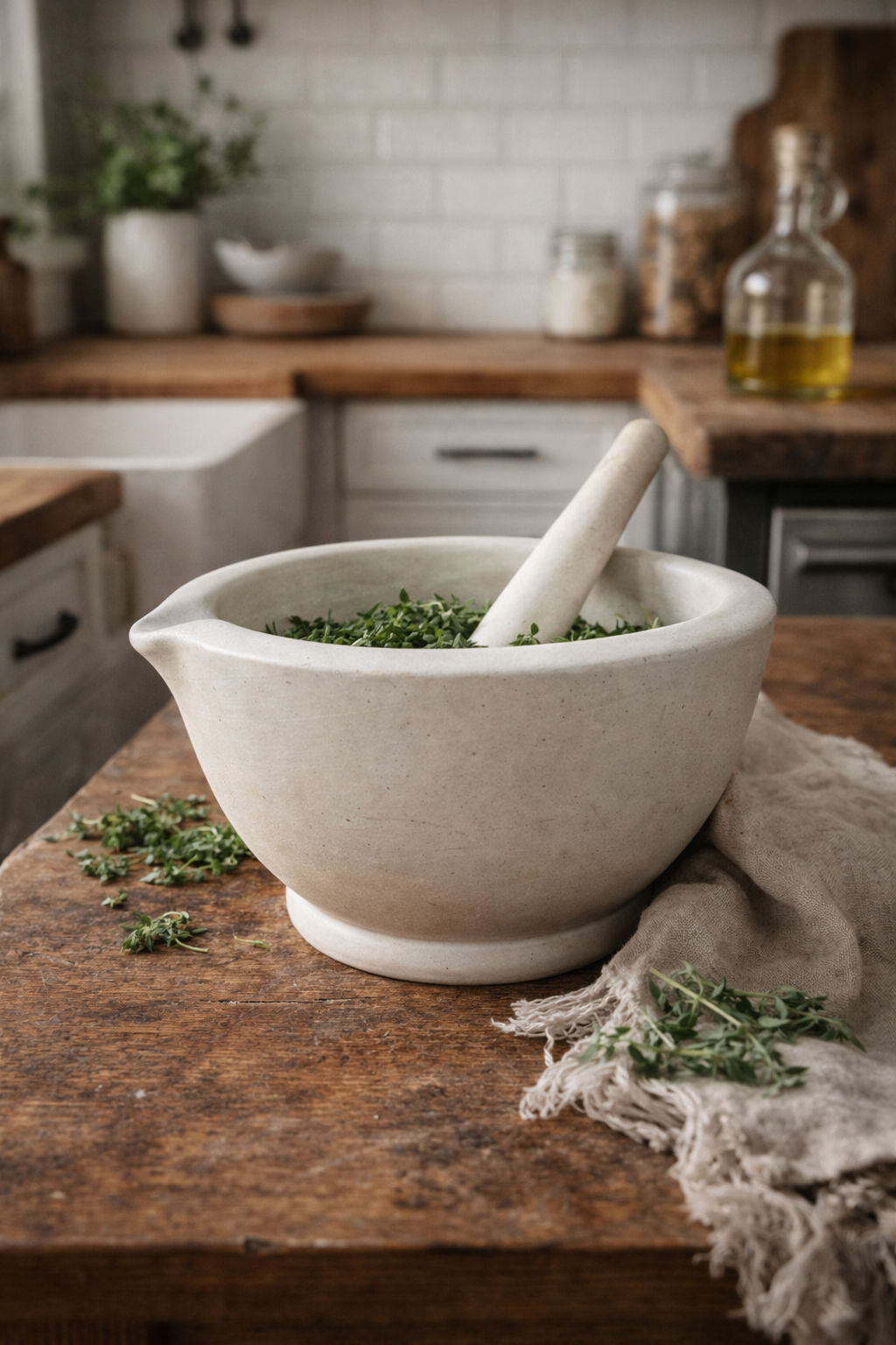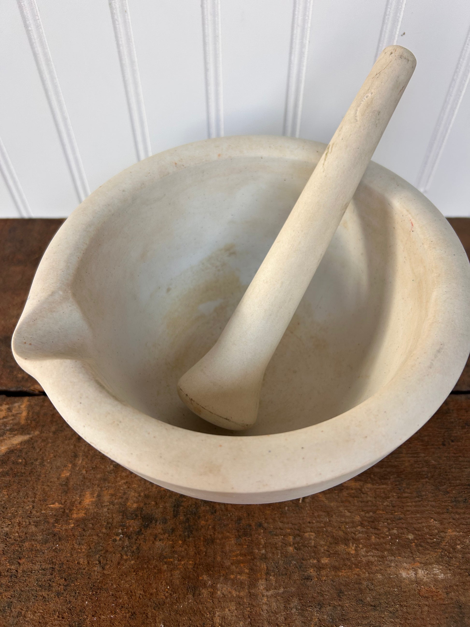 This set is in remarkably well-preserved condition with no cracks or chips, and the original pestle matches perfectly — a rarity for a piece of this age. The grinding interior shows appropriate surface texture for use and authenticity, while the exterior has a smooth, vitrified finish with mild discoloration from time and handling.