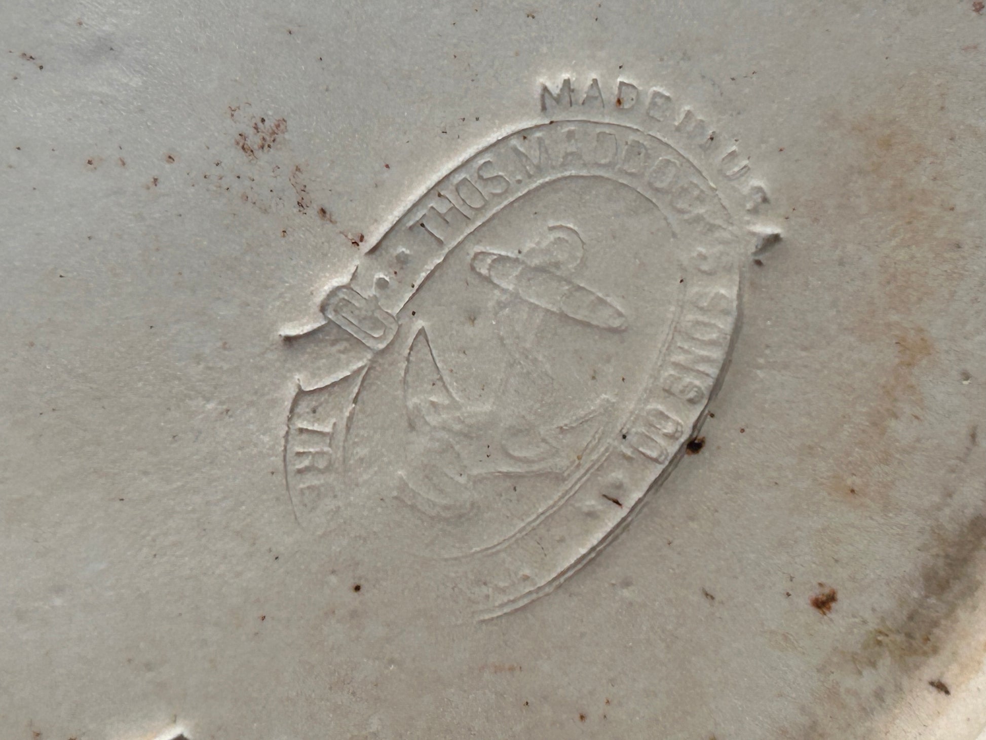 A stunning and rare matched mortar & pestle set stamped Thos. Maddock’s Sons Co – Made in U.S.A. This heavy ironstone laboratory/pharmacy mortar was manufactured in Trenton, New Jersey between the late 1800s and early 1900s, and features the characteristic impressed mark and “acid proof” stamp associated with early scientific and apothecary tools.