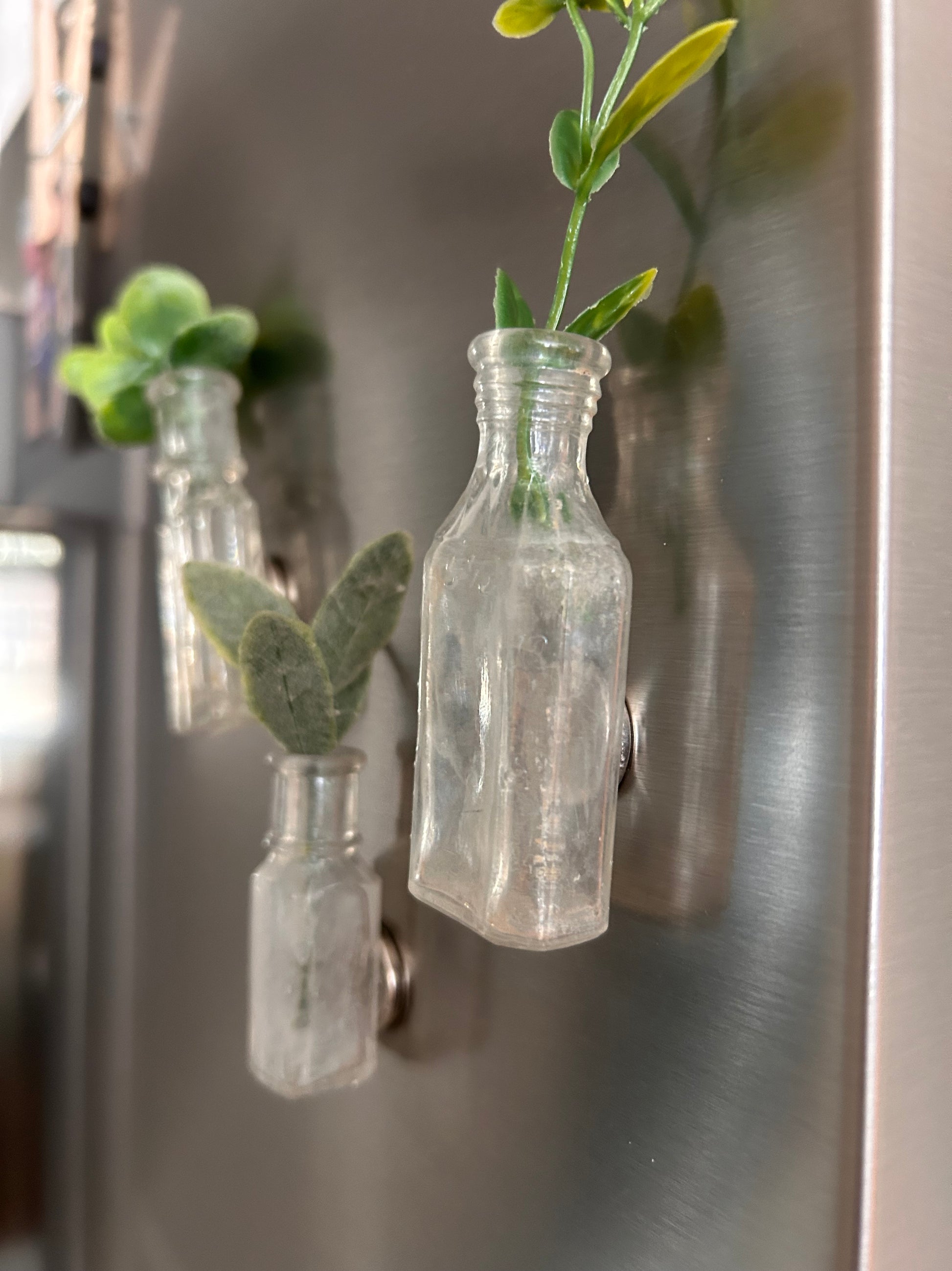 These antique bottle magnetic vases are made from authentic, dug antique glass bottles, each thoughtfully preserved and paired with a strong magnet for effortless styling on refrigerators, whiteboards, and other magnetic surfaces.