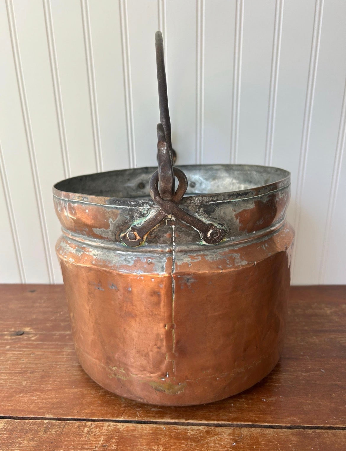 A relic from a simpler, fire-warmed time — this antique copper cauldron carries the quiet dignity of something that’s served its purpose well. Hand-forged with a heavy iron swing handle and stitched seams along the base, it shows the craftsmanship of an era when every household piece was built to last.