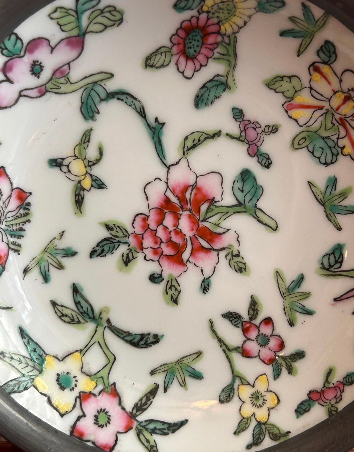 This vintage porcelain dish features hand-decorated floral motifs inspired by traditional Asian designs. The pewter exterior gives the piece a grounded, old-world feel, creating a beautiful balance between delicacy and substance.