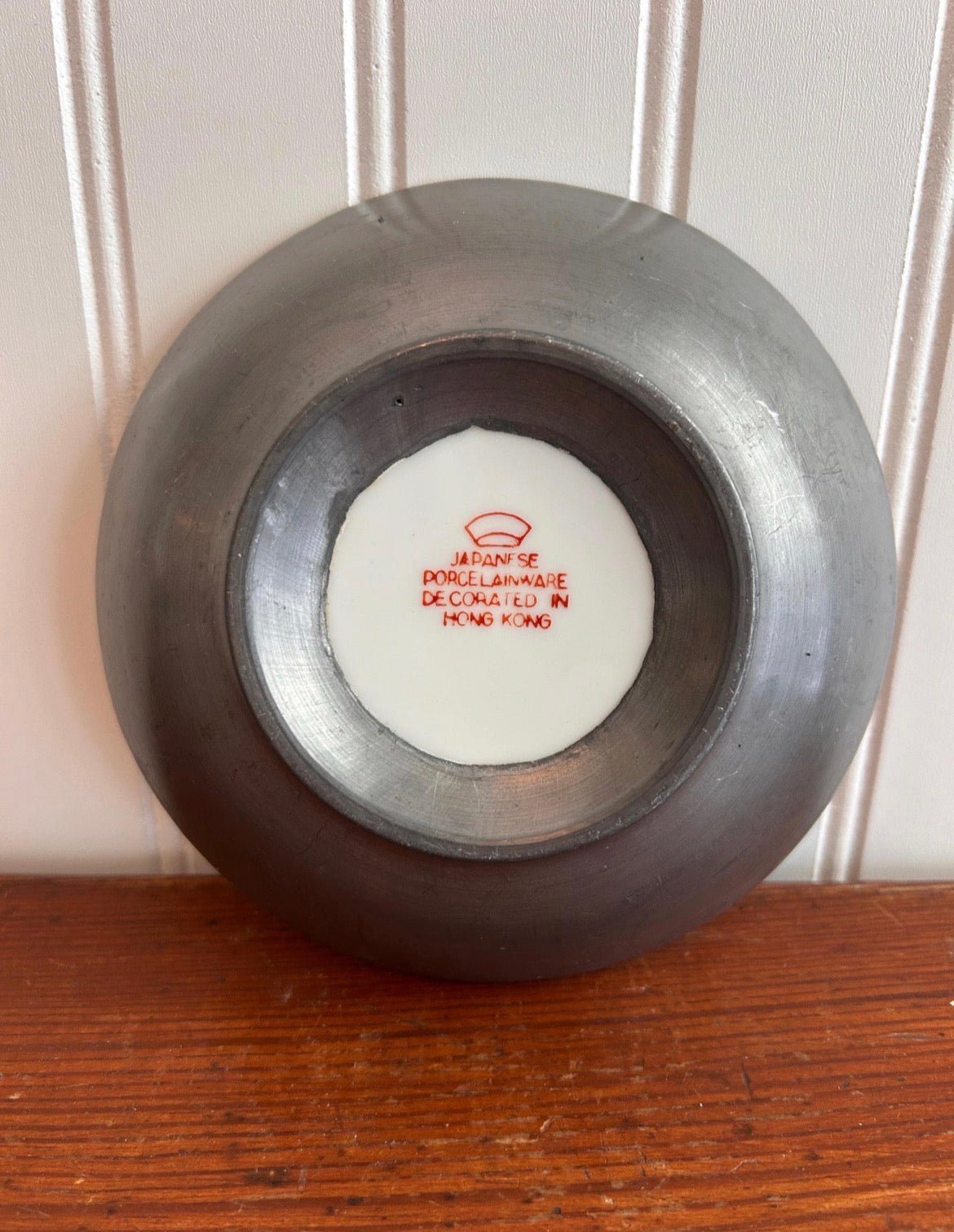 Vintage Floral Porcelain Dish with Pewter Wrap
