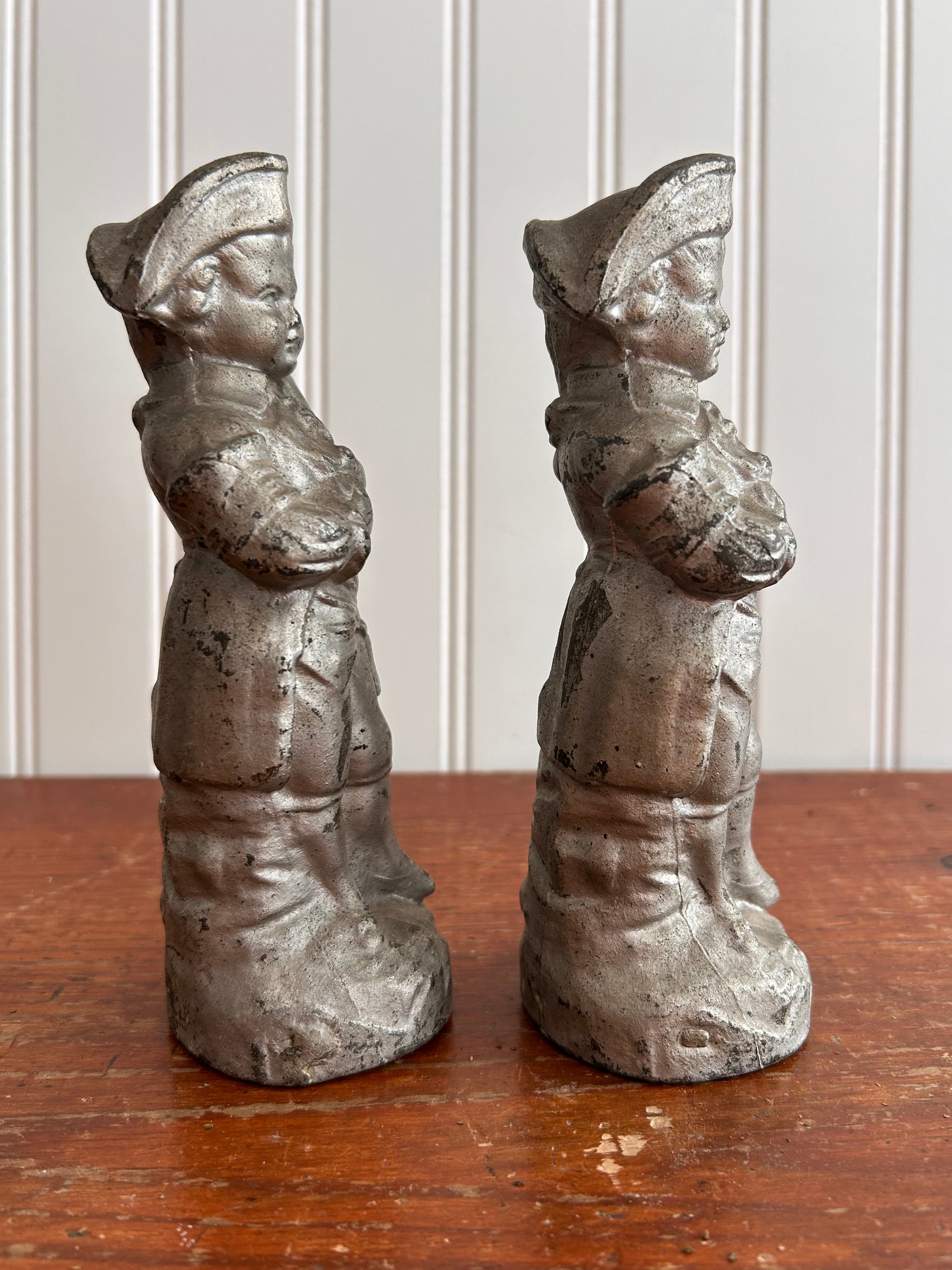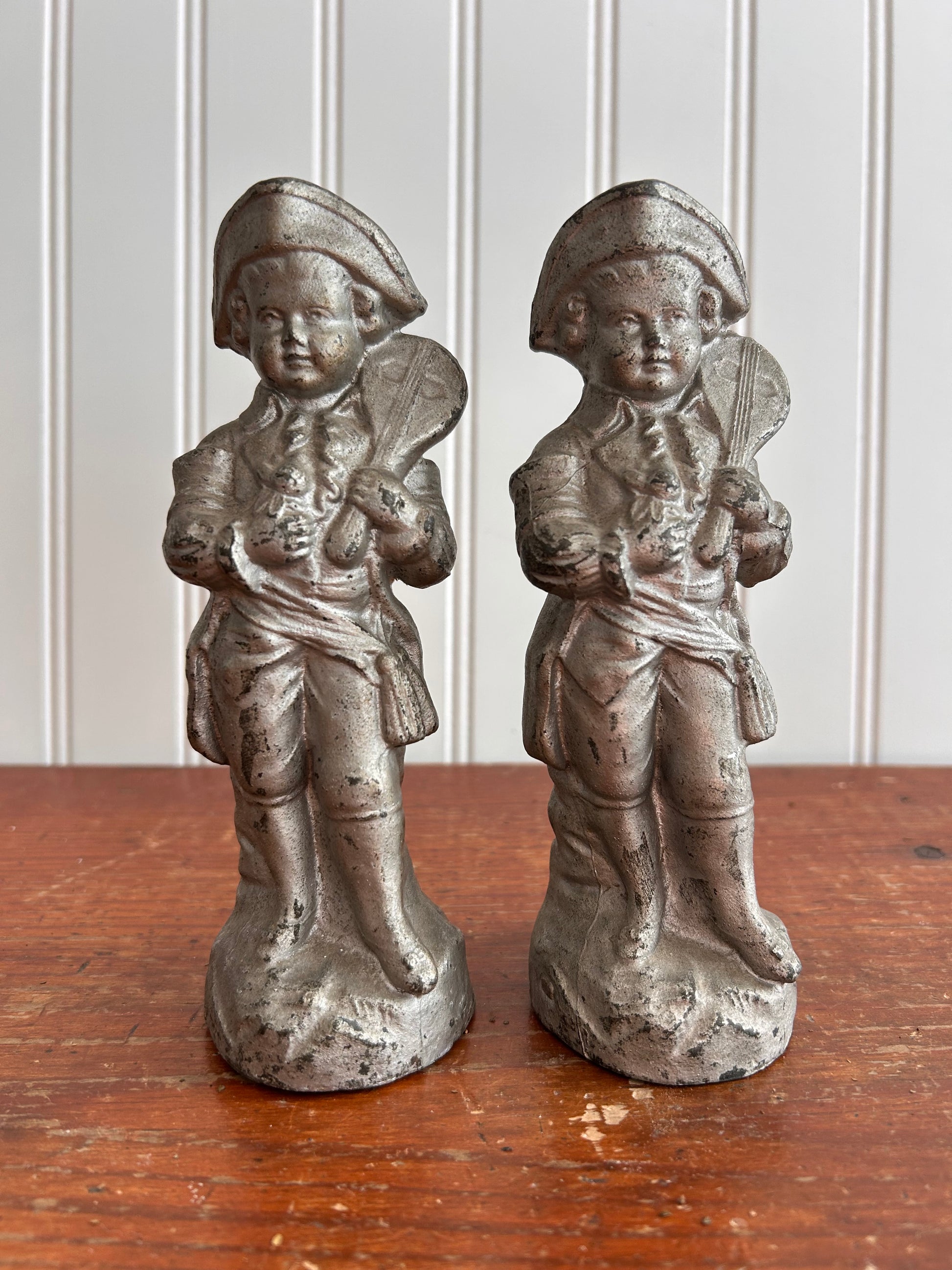 This charming pair of vintage metal figurines features colonial-era musicians dressed in period attire, each holding an instrument and standing on a weighted base. With their timeworn silver-gray patina and visible age marks, these pieces bring an old-world, collected feel that’s perfect for bookshelves, mantels, or styled vignettes.